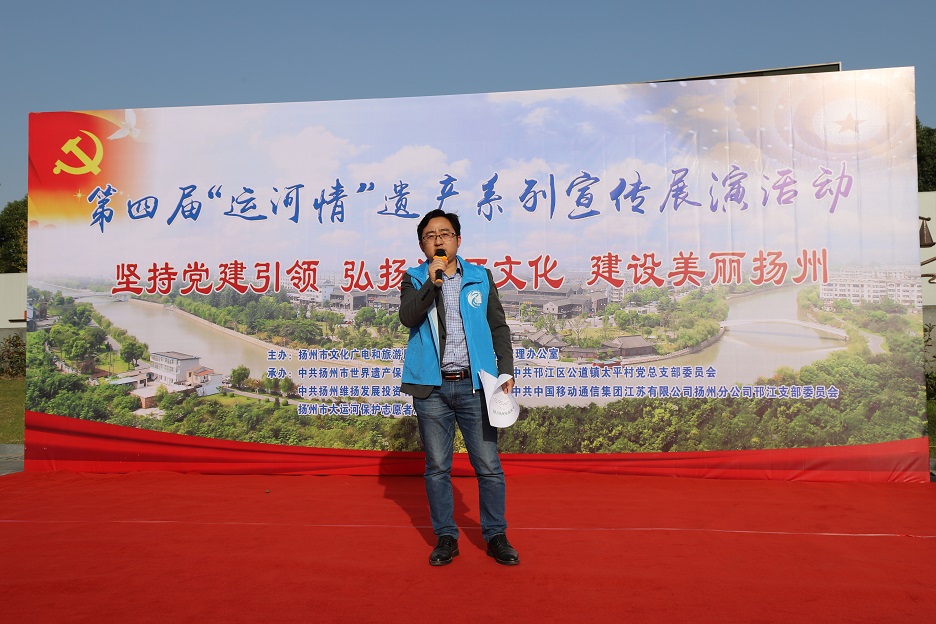 為充分發(fā)揮廣大市民在大運河遺產(chǎn)保護、傳承和利用中的重要作用,深入挖掘大運河的歷史、科學(xué)、文化價(jià)值,宣傳普及大運河遺產(chǎn)知識,11月8日下午,在蜀岡體育公園舉辦了以“堅持黨建引領(lǐng) 弘揚運河文化 建設美麗揚州”為主題的第四屆“運河情”遺產(chǎn)宣傳展演系列活動(dòng)。 本次活動(dòng)由揚州市文化廣電和旅游局、大運河遺產(chǎn)保護管理辦公室主辦,由中共揚州市世界遺產(chǎn)保護管理辦公室支部委員會(huì )、中共揚州市邗江區公道鎮太平村總支部委員會(huì )、中共揚州維揚發(fā)展投資有限公司支部委員會(huì )、中共中國移動(dòng)通信集團江蘇有限公司揚州分公司邗江支部委員會(huì )、揚州市大運河保護志愿者總隊聯(lián)合承辦。 活動(dòng)共有四個(gè)環(huán)節:首先,由專(zhuān)業(yè)人士解讀大運河文化帶建設相關(guān)政策和規劃。